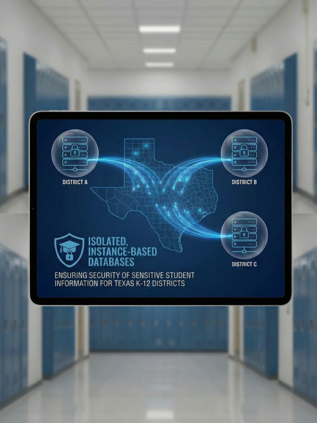 Data privacy through isolated, instance-based databases, ensuring the security of sensitive student information for Texas K-12 districts.